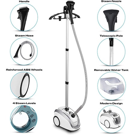 - Vaporización fácil de usar: El ajuste de vapor de 4 niveles controla el vapor de alta presión para una experiencia de planchado fácil, eficaz y eficiente junto con su manguera tejida, la percha de ropa de lujo y el cepillo de tela, planchar al vapor nunca ha sido más fácil.