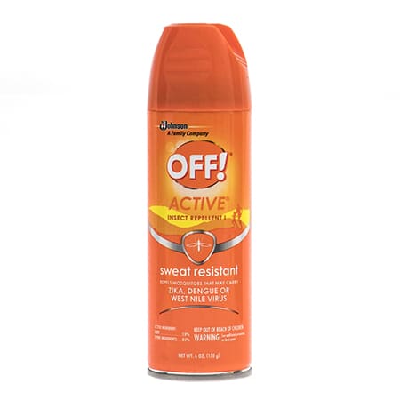 Repelente en aerosol resistente al sudor, repele mosquitos que podrían portar el virus del Dengue, Zika o virus del oeste del Nilo. Los mosquitos son atraídos por el ácido láctico, una sustancia química presente en el sudor. Por lo tanto, cuando usted y su familia estén activos, asegúrense de usar OFF! Active repellent. Brinda protección resistente al sudor para mantener alejados a los insectos que pican.